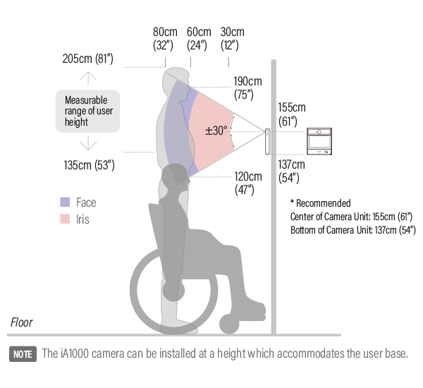 | Operating Range | Iris Camera: (30 – 60cm (12 – 24”) / Face Camera: 30 – 80cm (12 – 32“ ) |